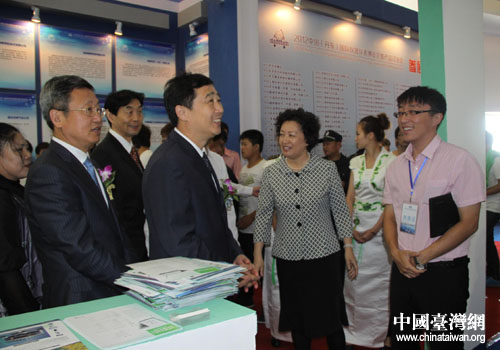 遼寧省副省長劉國強(qiáng)、丹東市委書記戴玉林參觀臺(tái)灣昱家科技展位。(圖片來源:丹東市臺(tái)辦)
