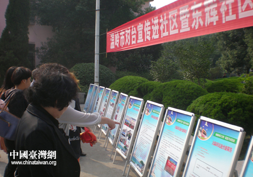市臺(tái)辦以太平街道東輝社區(qū)為宣傳窗口,制作大陸居民赴臺(tái)旅游管理辦法、大陸居民赴臺(tái)游簡答、兩岸直航航點(diǎn)、兩岸人員往來、兩岸交流基地、惠臺(tái)政策、涉臺(tái)政策簡答七個(gè)方面內(nèi)容宣傳展板,結(jié)合東輝社區(qū)趣味性運(yùn)動(dòng)會(huì),組織東輝社區(qū)居民參觀,并組織全市各鎮(zhèn)(街道)負(fù)責(zé)對臺(tái)工作的同志前來觀摩學(xué)習(xí),他們紛紛表示將展板進(jìn)社區(qū)宣傳的同時(shí),進(jìn)鎮(zhèn)(街道)、進(jìn)學(xué)校,從而在全市范圍內(nèi)掀起開展涉臺(tái)宣傳教育活動(dòng)的熱潮。(中國臺(tái)灣網(wǎng)溫嶺市臺(tái)辦通訊員 趙春林)