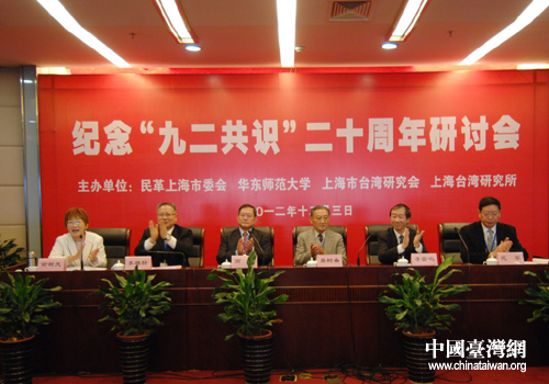 中國臺灣網(wǎng)12月3日上海消息 今天上午,由民革上海市委、上海臺灣研究所、上海市臺灣研究會、華東師范大學(xué)交流與區(qū)域發(fā)展研究所聯(lián)合舉辦的紀(jì)念“九二共識”二十周年研討會在上海民主黨派大廈舉行。海協(xié)會原常務(wù)副會長唐樹備、上海市臺辦副主任李雷鳴、華東師范大學(xué)副校長范軍、中國國民黨大陸事務(wù)委員會主任高輝,以及臺灣前;鶗倍麻L兼秘書長邱進(jìn)益等出席了會議。