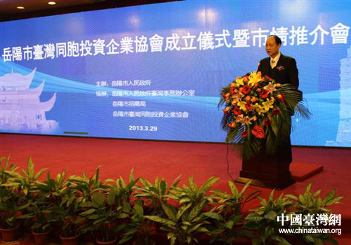 中國(guó)臺(tái)灣網(wǎng)4月3日岳陽(yáng)消息 日前,由岳陽(yáng)市人民政府主辦,市臺(tái)辦、市招商局、市臺(tái)協(xié)共同承辦的岳陽(yáng)市臺(tái)灣同胞投資企業(yè)協(xié)會(huì)成立儀式暨市情推介會(huì)在煙波浩淼的洞庭湖畔,氣勢(shì)雄偉的岳陽(yáng)樓下,風(fēng)景秀美的南湖之濱隆重舉行。臺(tái)灣;鶗(huì)董事長(zhǎng)林中森一行,全國(guó)臺(tái)企聯(lián)總會(huì)長(zhǎng)郭山輝、常務(wù)副會(huì)長(zhǎng)兼秘書長(zhǎng)何世忠,國(guó)臺(tái)辦綜合局副局長(zhǎng)、海協(xié)會(huì)副秘書長(zhǎng)鄭崇陽(yáng),省臺(tái)辦主任馮波,各地臺(tái)協(xié)會(huì)長(zhǎng)和重要臺(tái)商聚集岳陽(yáng)。
