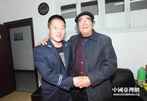 老臺(tái)胞萬(wàn)分感謝,緊緊握住的哥的手。(圖片來(lái)源:青島市臺(tái)辦)