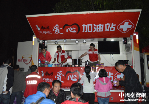 康師傅在蘆山縣設(shè)立“愛(ài)心加油站”現(xiàn)場(chǎng)為災(zāi)民及救援人員提供烹煮好的熱泡面。(圖片來(lái)源:四川省臺(tái)辦)