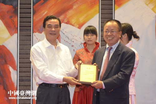 廣東省臺辦主任陳國興向新任會(huì)長許朝財(cái)頒發(fā)證書。(圖片來源:陽江市臺辦)