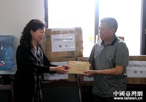 四川省臺(tái)辦巡視員楊永培(左)代表省臺(tái)辦機(jī)關(guān)黨委向李冰村黨支部捐贈(zèng)黨費(fèi)和圖書(shū)。(圖片來(lái)源:四川省臺(tái)辦)