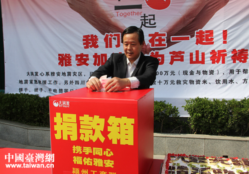 中國(guó)臺(tái)灣網(wǎng)5月10日阜陽(yáng)消息 日前,大潤(rùn)發(fā)阜陽(yáng)店商業(yè)有限公司組織全體員工,在大潤(rùn)發(fā)廣場(chǎng)舉行隆重的捐贈(zèng)儀式,捐款儀式邀請(qǐng)了市臺(tái)辦、紅十字會(huì)、公證處等參加了現(xiàn)場(chǎng)。