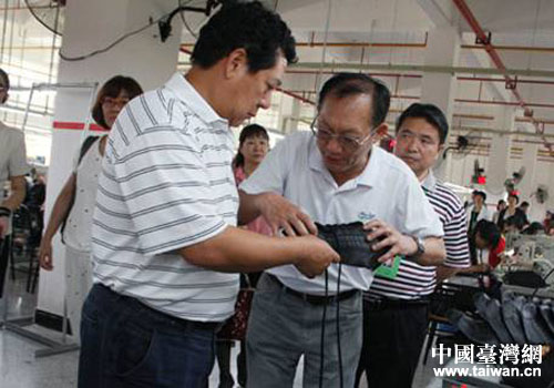 考察團李世平(左一)一行在寧遠(yuǎn)縣臺資企業(yè)華榮鞋業(yè)考察,企業(yè)經(jīng)理曾文鋒(中)作講解。(圖片來源:寧遠(yuǎn)縣臺辦)