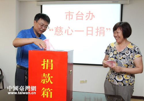 中國(guó)臺(tái)灣網(wǎng)7月8日東營(yíng)消息 7月4日,東營(yíng)市臺(tái)辦開展了以“攜手慈善、共創(chuàng)和諧”為主題的“慈心一日捐”活動(dòng);顒(dòng)中,全體干部職工積極響應(yīng),踴躍捐款,奉獻(xiàn)愛心,共捐獻(xiàn)善款5200元,以實(shí)際行動(dòng)弘揚(yáng)中華民族樂善好施、扶貧濟(jì)困的傳統(tǒng)美德。(中國(guó)臺(tái)灣網(wǎng)、東營(yíng)市臺(tái)辦聯(lián)合報(bào)道)