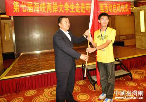 省臺(tái)辦主任趙勇向大學(xué)生代表授旗。(圖片來(lái)源:青海省臺(tái)辦)