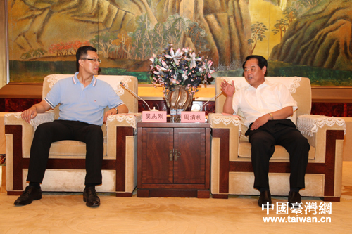 淄博市委書(shū)記周清利與吳志剛親切交談。(圖片來(lái)源:淄博市臺(tái)辦)