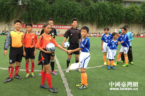 少年足球交流賽第一場開賽前,臺灣豐里小學向都勻九小贈送足球。(圖片來源:黔南州、都勻市臺辦)