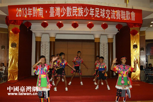 聯歡會上,來自臺東縣豐里小學少年足球隊員穿著民族的盛裝表演臺灣阿美族舞蹈、古箏獨奏和吉他彈唱,都勻市九小足球隊員們則送上了少年國際舞的表演,使大家沉醉在歌舞的海洋。在臺灣小朋友拉著來賓和都勻市小朋友的手,一起跳、一起唱臺灣阿美族《海洋之歌》之歌,把聯歡會推向高潮。(中國臺灣網黔南州臺辦通訊員 羅世云)
