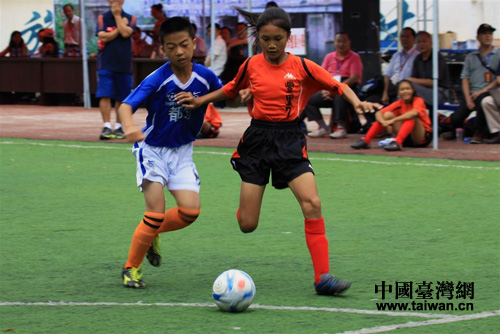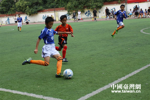 第六場(chǎng),臺(tái)灣豐里小學(xué)少年足球隊(duì)與楊柳街小學(xué)少年足球隊(duì)爭(zhēng)奪第一名。(圖片來源:黔南州臺(tái)辦)