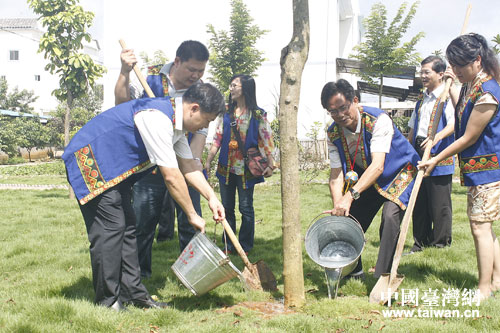 一下車就與村民們熱烈地?fù)肀А⑽帐,就像見到了久別的親人故友。去年4月16日,在同樣的地點(diǎn),臺灣同胞們受到了同樣熱情的接待。今日重返故地,鄉(xiāng)音依舊,唯有不同的是,霞山比去年漂亮多了。尤其是去年兩岸共同栽下的那棵友誼樹,如今已經(jīng)長到了兩米多高。