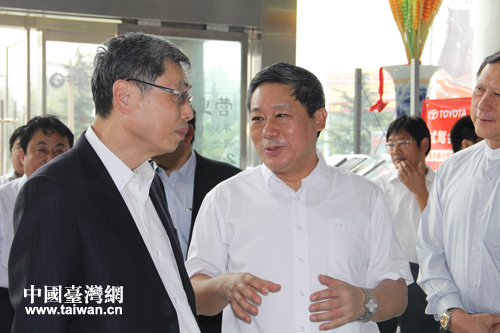 高孔廉(左)在棗莊市市長(zhǎng)張術(shù)平陪同下考察臺(tái)資企業(yè)。(圖片來(lái)源:棗莊市臺(tái)辦)