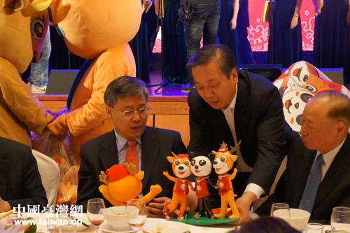 威海市臺辦主任于連波在聯(lián)誼會現(xiàn)場展示威海制作的動物玩偶。(圖片來源:威海市臺辦)