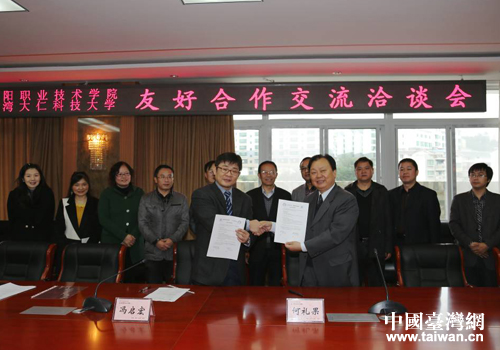 中國臺灣網(wǎng)11月7日綿陽消息 日前,臺灣大仁科技大學(xué)兩岸事務(wù)處處長馮啟宏博士一行前往綿陽職業(yè)技術(shù)學(xué)院開展參訪交流活動,兩校就深入開展學(xué)科領(lǐng)域的科研合作、師生互訪、教材編纂等方面的學(xué)術(shù)交流簽署了合作備忘錄。綿陽職業(yè)技術(shù)學(xué)院黨委書記文曉璋,黨委副書記、院長何禮果,黨委常委、副院長肖爭鳴出席交流座談會和合作備忘錄簽署儀式。