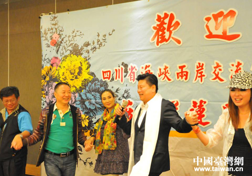 花蓮縣長(zhǎng)傅崐萁(右二)設(shè)宴歡迎四川民族歌舞赴臺(tái)交流團(tuán)一行,席間與交流團(tuán)一行手拉手跳藏族歌莊。(圖片來(lái)源:四川省臺(tái)辦)