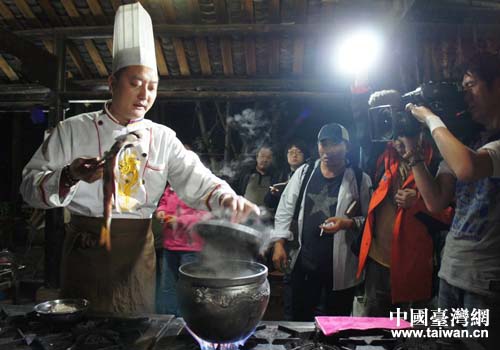 臺(tái)灣中時(shí)媒體集團(tuán)采訪組一行采訪拍攝著名的“雅魚”現(xiàn)場烹制。(圖片來源:四川省臺(tái)辦)