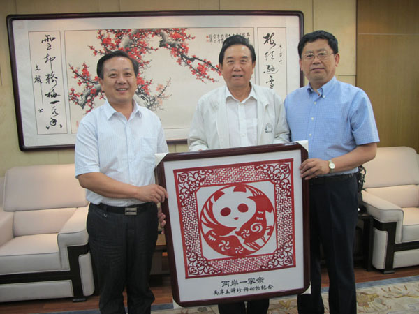 威海臺(tái)辦主任于連波向前任海協(xié)會(huì)長陳云林贈(zèng)送“兩岸一家親”刺繡標(biāo)識。左一為于連波主任、中為前海協(xié)會(huì)陳云林會(huì)長、右一為時(shí)任威海劉公島管委會(huì)主任袁學(xué)恩(高江濤 攝)