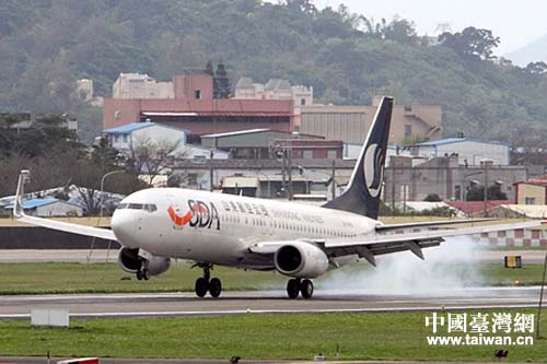 山航濟(jì)南-花蓮直航班機(jī)在臺灣花蓮機(jī)場降落。(圖片來源:山東省臺辦)