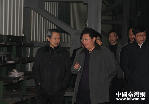 曹曉武一行(左)在淄博市臺辦主任王秀輝陪同下視察臺資企業(yè)山東國弘重工機(jī)械有限公司。(圖片來源:淄博市臺辦)