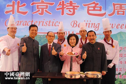 中華海峽兩岸企業(yè)交流協(xié)會(huì)理事長黃建雄、高雄河邊餐飲集團(tuán)董事長張素鑾、臺(tái)灣特型演員葉重順推介全聚德烤鴨。(北京通訊員 郭寧 攝)