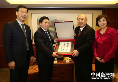 中國(guó)國(guó)民黨榮譽(yù)主席、“世界客屬總會(huì)”總會(huì)長(zhǎng)吳伯雄(右二)贈(zèng)送他為開(kāi)封市的題詞。(圖片來(lái)源:開(kāi)封市臺(tái)辦)