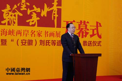 天津市武清區(qū)區(qū)委書(shū)記張勇在海峽兩岸名家書(shū)畫(huà)展暨“劉氏等造石佛塔”恭送儀式上致辭。(中國(guó)臺(tái)灣網(wǎng) 雍紫薇 攝)