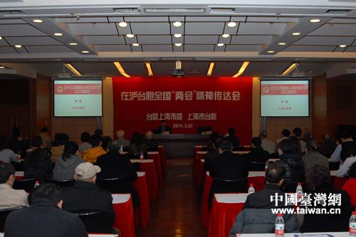 中國臺灣網(wǎng)3月24日上海消息 3月22日上午,上海市臺聯(lián)、臺盟上海市委聯(lián)合舉辦2014年在滬臺胞全國“兩會”精神傳達會。全國人大代表、上海市臺聯(lián)副會長張雄,全國政協(xié)委員、臺盟上海市委副主委高美琴分別傳達了十二屆全國人大二次會議精神和十二屆全國政協(xié)二次會議精神。全國人大代表、臺盟上海市委秘書長李碧影主持。中共上海市臺聯(lián)黨組書記季平、市臺聯(lián)會長盧麗安,副會長莊振文及上海市臺胞九代會代表、特邀代表,臺籍人大代表、政協(xié)委員,區(qū)縣臺聯(lián)會領導、機關離退休同志等120余人認真聽取了“兩會”精神傳達。