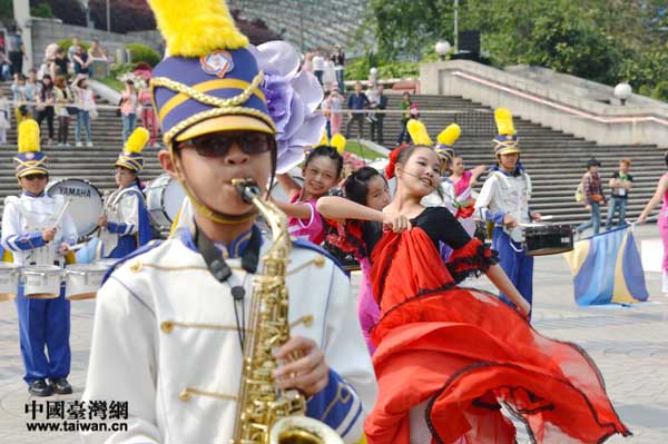 中國臺灣網(wǎng)5月2日上海消息 在5月1日開幕的“2014上海之春國際音樂節(jié)管樂藝術(shù)節(jié)上,一支身著藍白相間服裝,頂戴黃色花翎的隊伍十分引人注目。他們是來自臺灣的阿里山下的嘉義市博愛小學行進管樂隊。