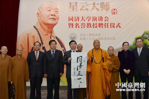 中國(guó)臺(tái)灣網(wǎng)5月4日上海消息 5月3日上午,臺(tái)灣佛光山開(kāi)山宗長(zhǎng)、國(guó)際佛光會(huì)世界總會(huì)會(huì)長(zhǎng)、禪門(mén)臨濟(jì)宗第48代傳人星云大師訪問(wèn)同濟(jì)大學(xué),并受聘為該校名譽(yù)教授。上海同濟(jì)大學(xué)黨委書(shū)記周祖翼會(huì)見(jiàn)了星云大師一行。校長(zhǎng)裴鋼向星云大師頒發(fā)名譽(yù)教授聘書(shū)并其佩戴了;。