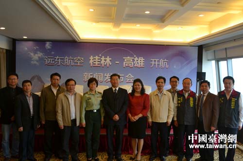 臺(tái)灣遠(yuǎn)東航空桂林-高雄航線(xiàn)開(kāi)航新聞發(fā)布會(huì)嘉賓合影。(圖片來(lái)源:桂林市臺(tái)辦)