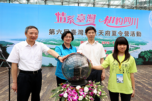 四川省臺(tái)辦主任周敏謙(左一)、省教育廳廳長(zhǎng)朱世宏(右二)、臺(tái)灣民意代表王惠美(左二)及臺(tái)灣學(xué)生代表(右一)共同按動(dòng)夏令營(yíng)啟動(dòng)球。(圖片來源:四川省臺(tái)辦)
