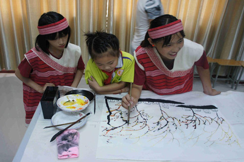 臺(tái)灣學(xué)生與文昌一小學(xué)生(中)共畫國畫。(圖片來源:四川省臺(tái)辦)