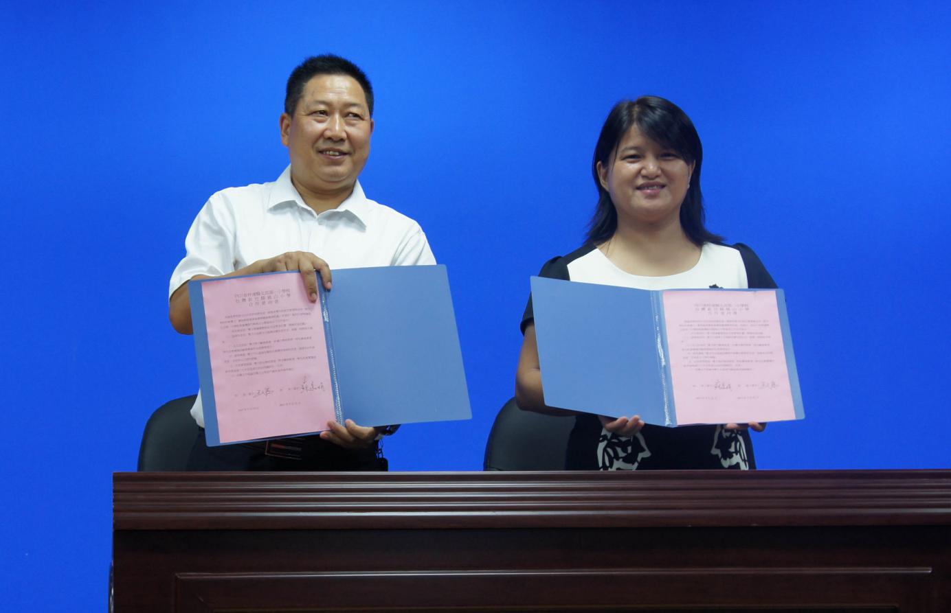 桃山小學(xué)校長蘇美娟(右)與文昌一小校長王義富(左)簽訂合作意向書。(圖片來源:四川省臺(tái)辦)