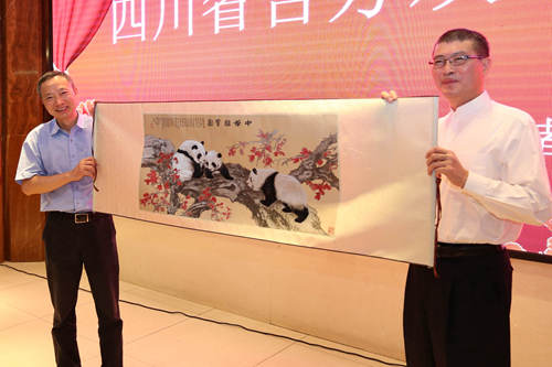 四川省臺(tái)辦主任周敏謙向臺(tái)灣寺廟金蘭會(huì)贈(zèng)送蜀錦熊貓禮品