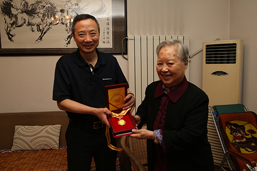 四川省臺(tái)辦主任周敏謙向彭宗萍同志發(fā)放中國人民抗日戰(zhàn)爭勝利70周年紀(jì)念章。