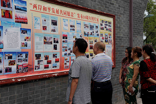 社區(qū)群眾觀看學(xué)習(xí)“兩岸和平發(fā)展共同愿景”發(fā)布10周年圖片展。(圖片來源:什邡市臺(tái)辦)