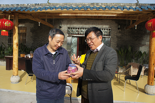 在南充雙龍農(nóng)牧開發(fā)有限公司,臺(tái)商林云飛(右)向周敏謙(左)介紹其開發(fā)的農(nóng)產(chǎn)品。
