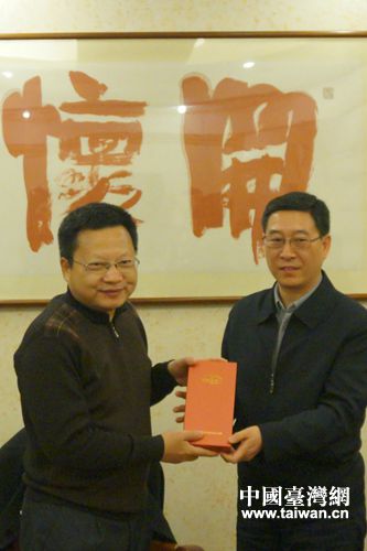 與福建省臺聯(lián)座談,北京市臺聯(lián)秘書長張曉軍(右)向福建省臺聯(lián)贈送紀(jì)念品。(圖片來源:北京市臺聯(lián))