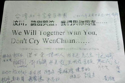 據(jù)悉,“5·12”汶川特大地震發(fā)生后,臺(tái)灣紅十字組織派遣陳長文(臺(tái)灣地區(qū)紅十字組織負(fù)責(zé)人)、彭芳谷(原臺(tái)北市醫(yī)師公會(huì)理事長、前榮總醫(yī)院院長、臺(tái)灣地區(qū)紅十字組織理事)等一行37人組成的醫(yī)療團(tuán),于5月20日至25日赴四川地震災(zāi)區(qū)開展醫(yī)療救援工作。25日下午,醫(yī)療隊(duì)準(zhǔn)備離川返回臺(tái)灣時(shí),醫(yī)療隊(duì)全體成員紛紛在一張賑災(zāi)募捐宣傳單上簽名,并遞交海協(xié)會(huì)以作紀(jì)念,由此留下了這份珍貴而特殊的實(shí)物。(中國臺(tái)灣網(wǎng)、綿陽市臺(tái)辦聯(lián)合報(bào)道)