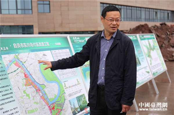 自貢市城投公司副總經(jīng)理蘇廣宇向媒體行記者講解西山、光鳳棚戶區(qū)改造過程。(中國臺灣網(wǎng) 肖靖璇 攝)