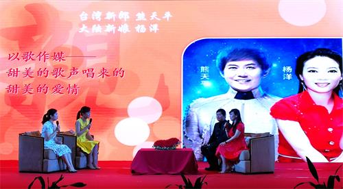“你我風風雨雨守護一個圈,把愛團團圓圓圍在心里面”,主題聯(lián)誼活動在臺灣藝人熊天平、楊洋夫婦動人的歌聲中拉開序幕。一個是才華橫溢的臺灣藝人,他的《火柴天堂》、《夜夜夜夜》等歌曲膾炙人口;一個是熱情奔放的北方妹子,也是一名創(chuàng)作型歌手。對音樂共同的熱愛讓熊天平和楊洋彼此牽手,并喜得一對龍鳳雙胞胎。談到婚姻的相處之道,楊洋說就是六個字“求大同,存小異”。她說:“我擅長粗獷的‘大歌’,他擅長細膩的情歌,這和我倆的性格也很相似,我大氣些,他細致些,這讓我們在工作和生活中起到很好的互補作用。”成長環(huán)境和思維方式的差異難免會讓婚姻產(chǎn)生摩擦,楊洋表示音樂是最好的“潤滑劑”,“一言不和就唱歌,唱著唱著,矛盾就漸漸消除了”。而熊天平認為“溝通”是婚姻中最重要的部分。兩岸婚姻有許多需要互相學習的方面,夫妻間更要包容和忍讓,他笑言“老婆說的即使不合理的也是合理的”。訪談中,熊天平溫文爾雅,話不多,楊洋則是快人快語,如同她身上的靚麗紅衫。當兩人現(xiàn)場清唱起那首耳熟能詳?shù)摹赌愕难劬Α窌r,濃濃愛意融化了在場所有人。
