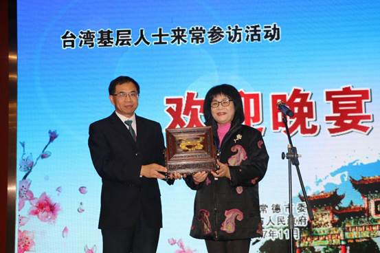 陳位明副主席與侯彩鳳女士互贈(zèng)禮品。(圖片來源:常德市臺(tái)辦)