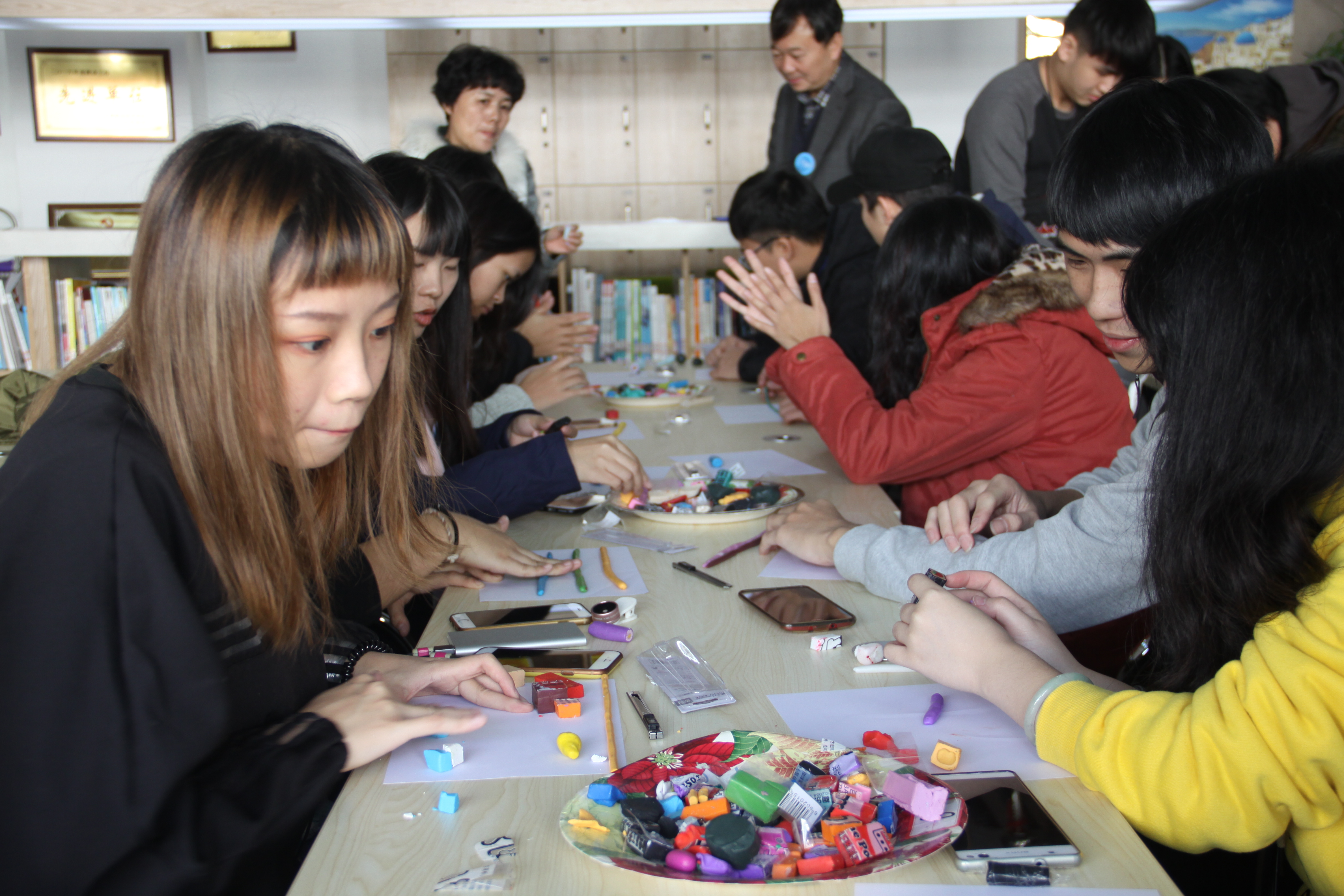 在日照職業(yè)技術(shù)學(xué)院,學(xué)院馮新廣院長、交流中心主任丁立孝為來訪師生舉行了歡迎儀式,向客人介紹了學(xué)院建設(shè)情況,并聘請臺灣銘傳大學(xué)曾子珊博士為學(xué)院客座教授。隨后,丁立孝主任陪同客人參觀了學(xué)院教學(xué)、實訓(xùn)設(shè)施,現(xiàn)場考察了學(xué)院文化創(chuàng)意中心,在老師的指導(dǎo)下現(xiàn)場制作陶泥手工藝品。曾子珊博士還為學(xué)院師生代表舉辦了一場以創(chuàng)意創(chuàng)新創(chuàng)業(yè)為主題的專題講座,受到師生的普遍歡迎。參訪期間,臺灣師生與日照職業(yè)技術(shù)學(xué)院的師生代表進行了座談交流和互動。
