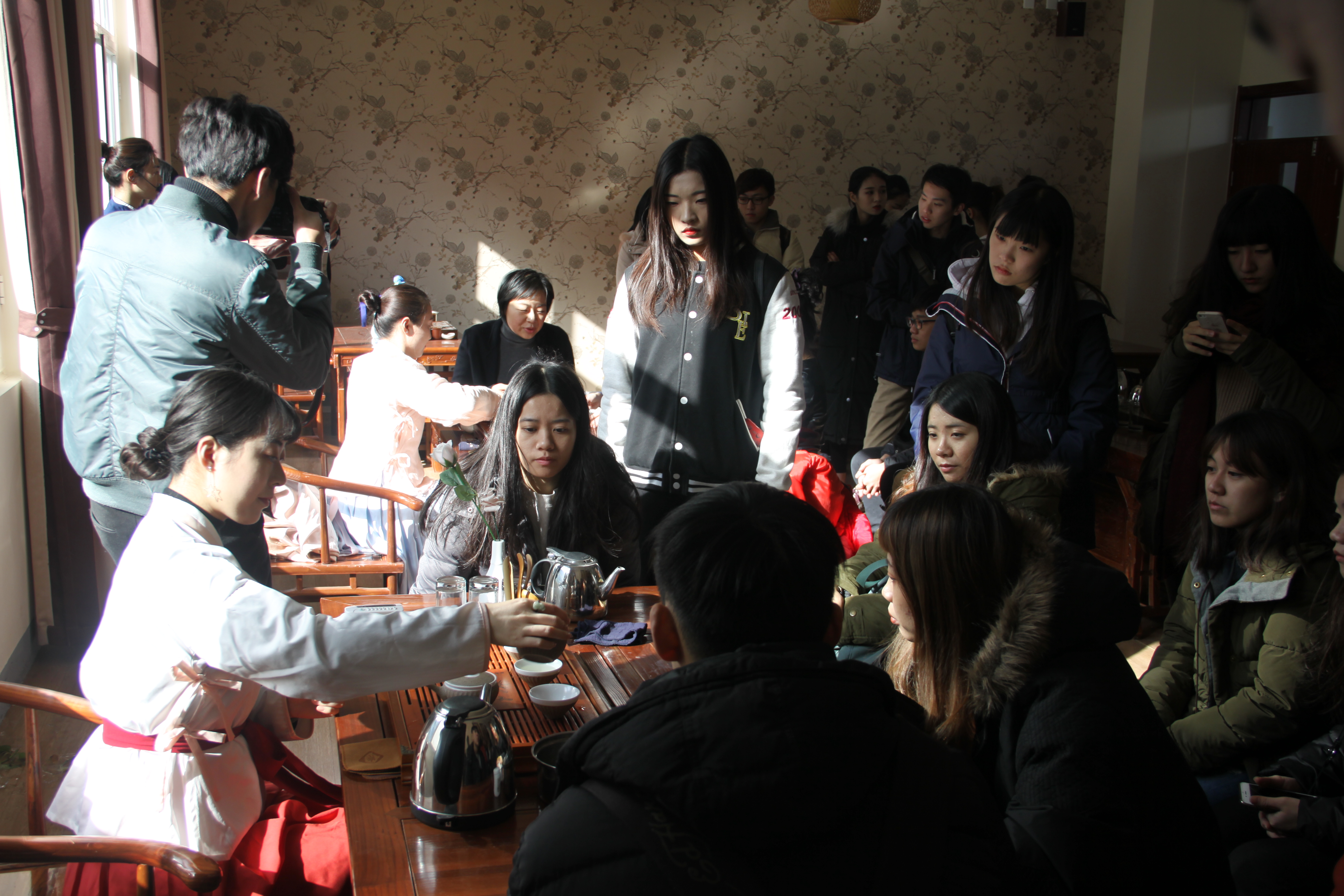 在山東外國語職業(yè)學(xué)院,學(xué)院交流中心暨港澳臺辦公室副主任秦敏熱情接待了參訪團一行。秦敏副主任向客人介紹了學(xué)院基本情況,陪同客人參觀考察了校園規(guī)劃、外國留學(xué)生公寓、茶藝工作室、民藝工作室、航空模擬艙、世界文化長廊和同聲傳譯實訓(xùn)室。靜雅的校園環(huán)境、便捷的基礎(chǔ)設(shè)施和先進的教學(xué)設(shè)備給臺灣的師生們留下了深刻的印象。在學(xué)院世界文化長廊,經(jīng)濟管理學(xué)院、航空旅游學(xué)院和國際交流學(xué)院的15名學(xué)生與臺灣學(xué)生進行了茶敘交談;中午,臺灣師生和山外師生共同到食堂就餐,兩岸青年學(xué)子的歡聲笑語、真誠互動和留戀不舍生動詮釋了“兩岸一家親”理念。