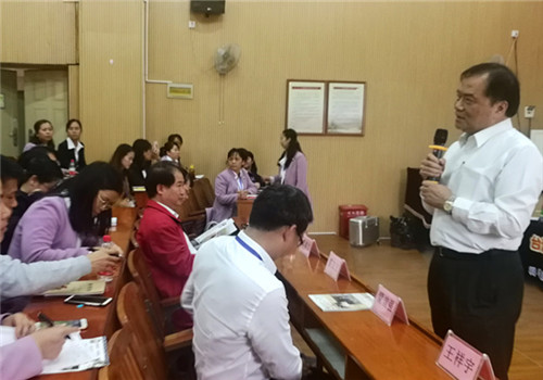 臺北市校長協(xié)會榮譽理事長張文宏在與南寧經(jīng)開區(qū)小學的老師交流