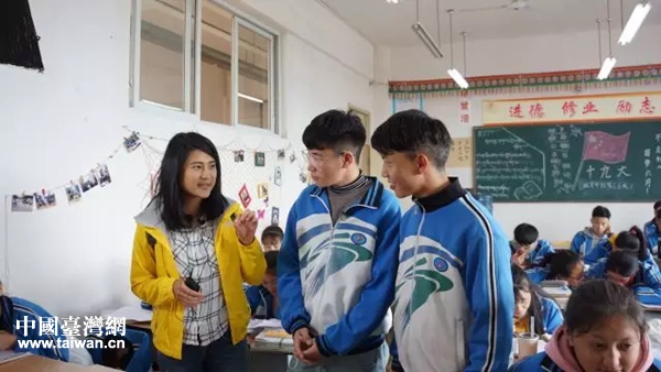 楊茵與“玉樹班”學(xué)生旦周才仁、尕尼瑪交流。(圖片來源:四川省臺辦)
