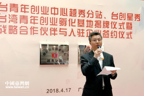 曾衛(wèi)東在揭牌儀式上致辭表示,近年來,我市以習(xí)近平新時(shí)代中國特色社會主義思想為指導(dǎo),深入貫徹黨的十九大精神和習(xí)近平總書記對臺工作重要思想,認(rèn)真貫徹落實(shí)國臺辦對臺工作部署,積極推進(jìn)臺灣青年來穗實(shí)習(xí)就業(yè)創(chuàng)業(yè)工作,先后創(chuàng)建立了以黃埔區(qū)臺企服務(wù)中心、天河區(qū)眾創(chuàng)五號空間“廣州臺灣青年之家”和花都大新美術(shù)館等為代表的一批面向臺灣青年的創(chuàng)業(yè)基地,并以基地為載體先后引進(jìn)臺灣青創(chuàng)項(xiàng)目和團(tuán)隊(duì)近50個(gè),提供臺灣青年就業(yè)崗位200多個(gè),接待實(shí)習(xí)體驗(yàn)的臺灣學(xué)生近千人,取得了良好效果。今天,在越秀區(qū)委、區(qū)政府的高度重視、大力支持和積極推動下,成立了越秀區(qū)首個(gè)臺灣青年創(chuàng)業(yè)基地,為臺灣青年到廣州市越秀區(qū)創(chuàng)業(yè)發(fā)展提供了平臺與服務(wù),進(jìn)一步推動和營造了臺灣青年在廣州創(chuàng)新創(chuàng)業(yè)良好氛圍。曾衛(wèi)東祝愿越秀區(qū)臺青創(chuàng)業(yè)基地盡快開花結(jié)果,希望越秀區(qū)根據(jù)國臺辦等部門日前頒布的《關(guān)于促進(jìn)兩岸經(jīng)濟(jì)文化交流合作的若干措施》(以下簡稱“31條措施”),結(jié)合實(shí)際,積極探索臺青工作新思路、新方法,制訂出臺有關(guān)推動臺灣青年創(chuàng)新創(chuàng)業(yè)的實(shí)施辦法,落實(shí)對臺灣青年在越秀區(qū)創(chuàng)新創(chuàng)業(yè)政策和資金扶持的具體措施,積極吸引鼓勵臺灣青年來廣州創(chuàng)業(yè)發(fā)展。