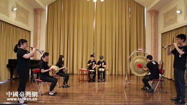 臺(tái)北藝術(shù)大學(xué)傳統(tǒng)音樂系的學(xué)生表演北管樂曲牌《斗鵪鶉》。(圖片來源:保定市臺(tái)辦)